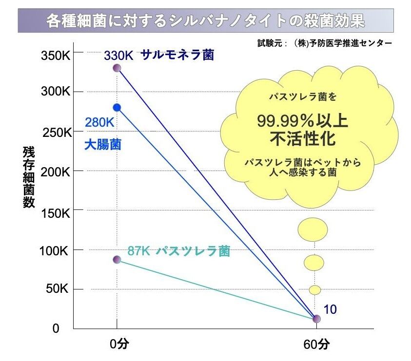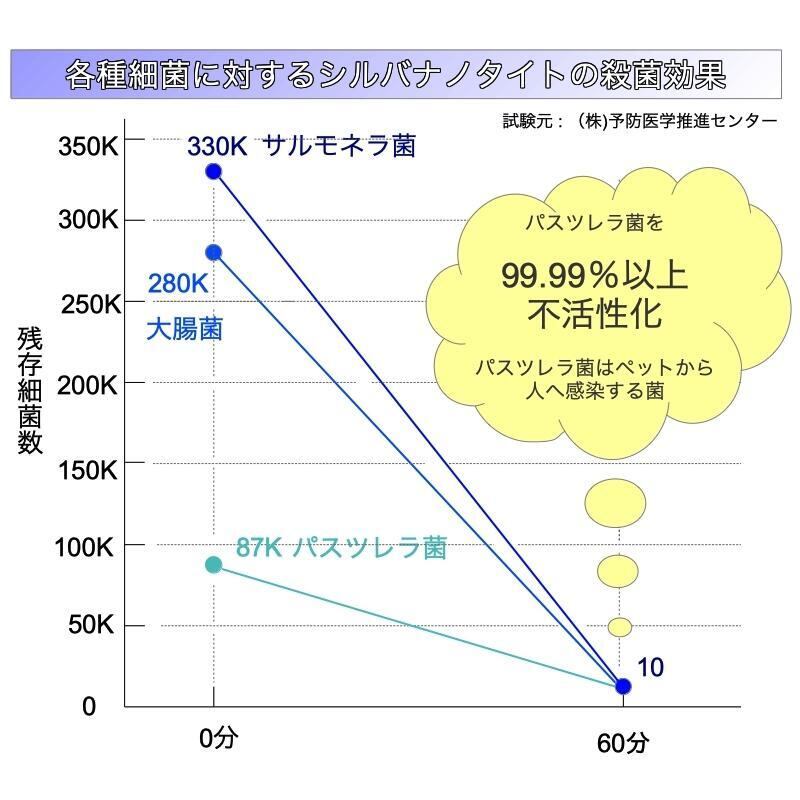 Agシャワーは、多くの細菌やウイルスを不活性化させる作用が認められています。ペットから人へ感染するパスツレラ菌、大腸菌、サルモネラ菌を60分後には99.99%以上を不活性化します。また、イヌパルボウイルスとヒトインフルエンザウィルスを30分後には99.9%以上を吸着します。