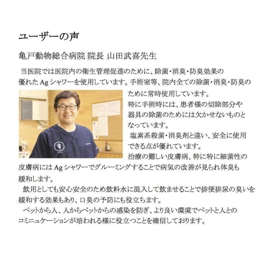 動物病院では、手術時の除菌、皮膚病の緩和、口臭予防など、様々なシーンでAgシャワーが使われています。ユニークな使い方として 水に混ぜて飲ませることでうんちやおしっこのニオイを和らげるために用いられています。